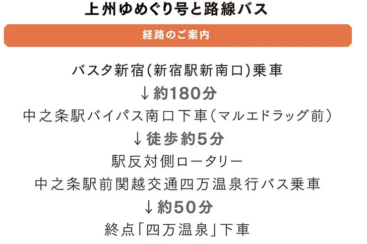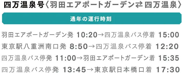 東京方面から四万温泉へお越しのお客様へ。直通の各社高速バスが運行しております。