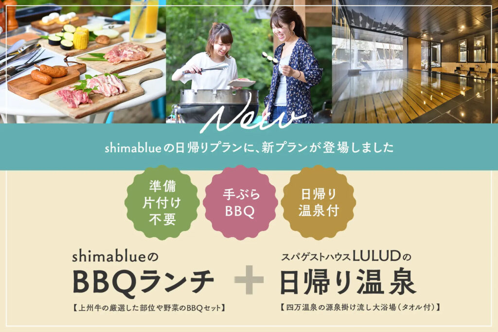 上信越国立公園の東部にあたる自然豊かな「shimablue」で過ごす、「手ぶらでOKのBBQランチ」と「2020年にオープンしたばかりのスパゲストハウスLULUDの日帰り温泉」をセットにしたプランです。