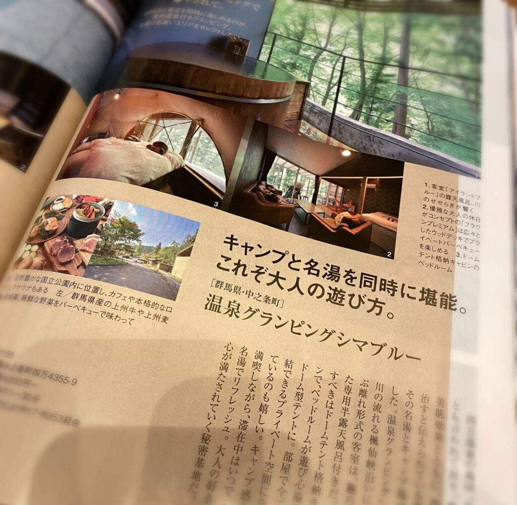 じゃらん〈大人のちょっと贅沢な旅〉に掲載いただきました 2023.03.22 メディア情報 じゃらんムックシリーズ 大人のちょっと贅沢な旅 2022-2023春夏号に、シマブルーを掲載いただきました。楓仙峡沿いに建つ絶好のロケーションや、シマブルーを代表するドームテント格納式のキャビンをご紹介いただきました。