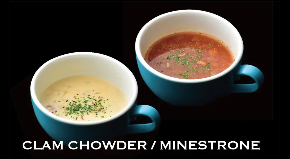 クラムチャウダーはブラックペッパー、ミネストローネはチーズ入りでコクのある味わいです。