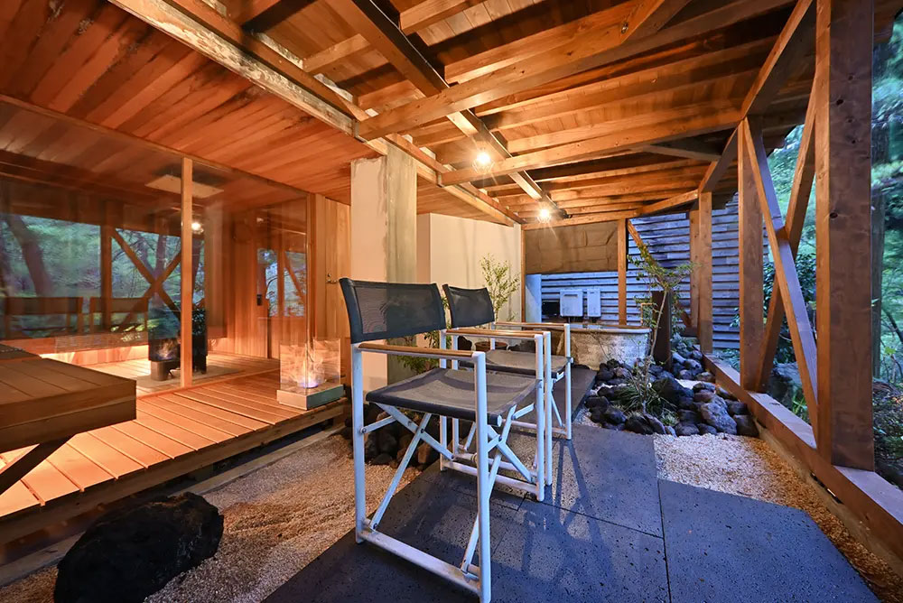 火照った体を心地よく冷やす開放的なウッドデッキには、四万温泉の景勝地「楓仙峡(ふうせんきょう)」の自然の眺めと青く輝く四万川のせせらぎが広がります。