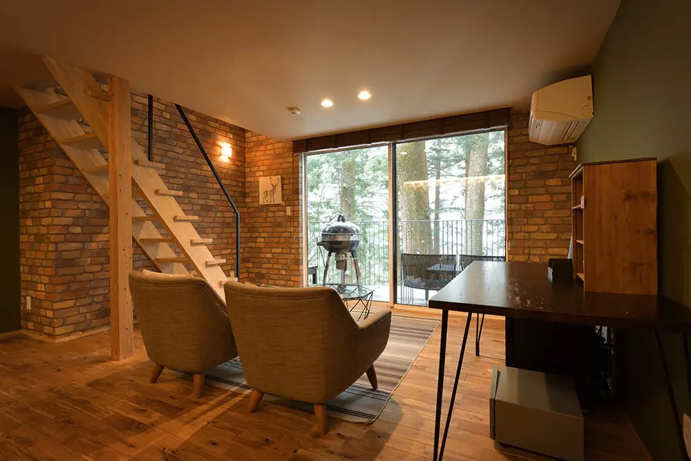 広々と開放的なキャビンのテーマは「自然との融合」。開放的な一階の温泉半露天風呂には温かな源泉の湯。森を眺める開放的な展望テラスには、プライベートにバーベキューを楽しめる焼台をセットしています。風が吹き抜ける二階のアウトドアリビングやボルダリングウォールなど遊び心があふれています。