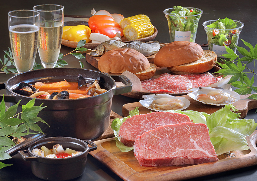 「日帰りBBQプラン」もご用意しています。【Day BBQプラン】と【Night BBQプラン】、ともにシマブルーフロント&カフェ棟内「ジュピターズキッチン」のテラス席でBBQをお楽しみいただきます。道具や食材一切不要の手ぶらでOK!片付けも不要なので気軽に楽しめます。