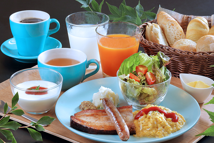 ご朝食は、フロント棟のカフェに群馬県産の3種のパンをセットにした自家製ソーセージ&ベーコンの洋食プレートをご用意いたします。お天気のいい日は山並みを望むテラスでのんびりと朝のひとときをお楽しみください。