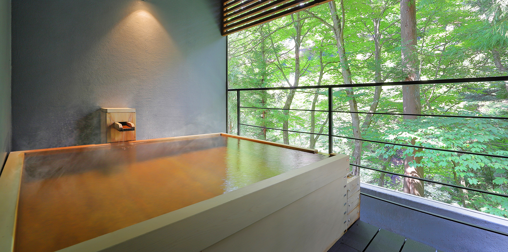 四万温泉の源泉を引いた檜の露天風呂はご家族でのご利用にもうれしい贅沢な広さです。