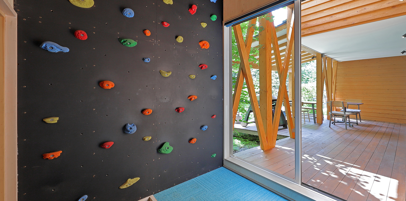 ブルーを基調とした室内は薪ストーブやミニキッチンの他、ボルダリングウォールも設置され、