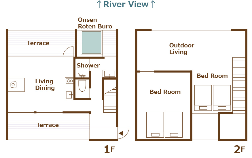 <1F> 温泉露天風呂+リビング・ダイニング+テラス(BBQ焼台 ガスグリル)+展望テラス+ボルダリングウォール+シャワー+トイレ+洗面所 <2F>アウトドアリビング+ベッドルーム(ダブルベッド×2)+ベッドルーム(ダブルベッド×2)