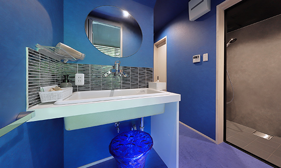 お部屋の内装はシマブルーのテーマカラーであるブルーを基調とした涼しげでクールな雰囲気。