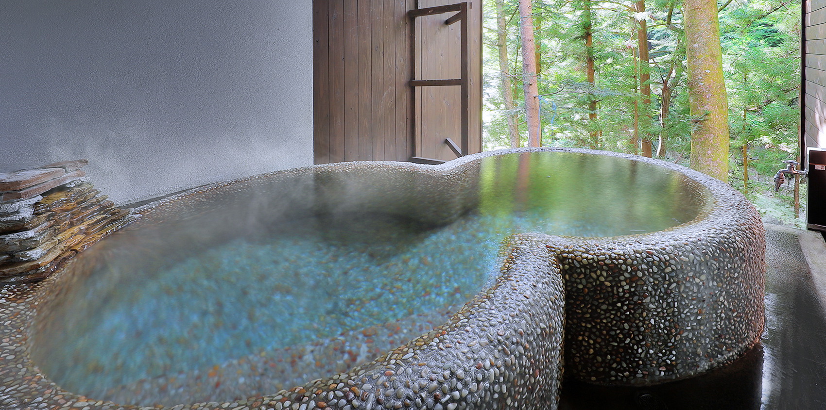 ひょうたん型の洗い出しの技法で製作したかわいらしいお風呂は、楓泉狭を眺めながら、お二人でもゆったり足を伸ばして入る事の出来る広さとなっております。