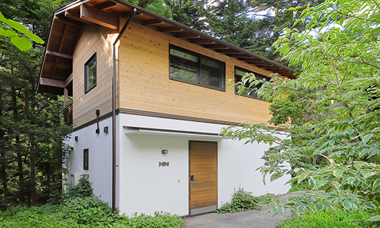 自然と調和するツートーンのお洒落な外観。メゾネットスタイルの室内はPOPなクロスやロッキングチェアなど、