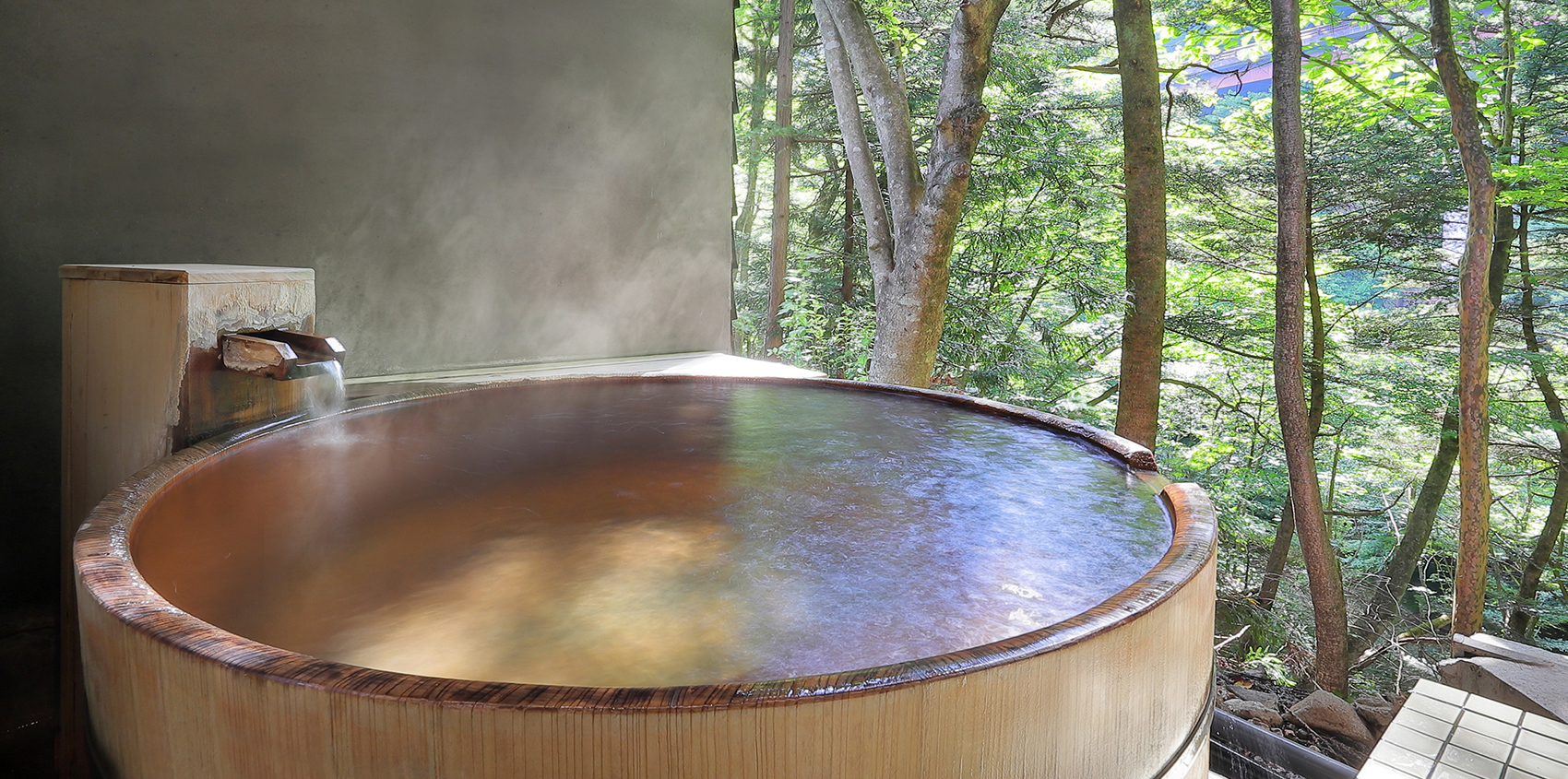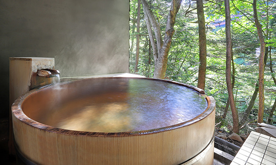 露天風呂は丸型の檜風呂。川のせせらぎを聞きつつ、星を眺めながらリラックスできる造りとなっております。