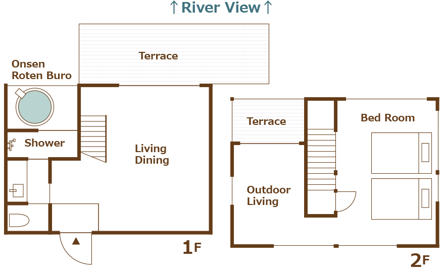 <1F> 温泉半露天風呂+リビング・ダイニング+展望テラス(BBQ焼台 炭グリル)+シャワー+トイレ+洗面所 <2F> アウトドアリビング+ベッドルーム(セミダブルロングベッド×2)+展望テラス