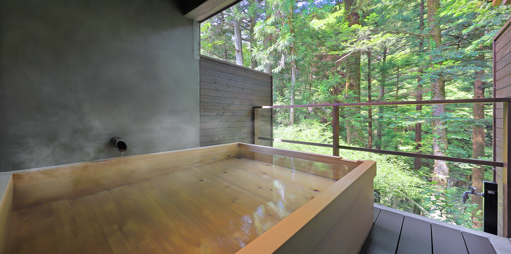 露天風呂は肌触りもなめらかな檜造り。シックな室内から望む鮮やかな四季の彩りをお楽しみください。