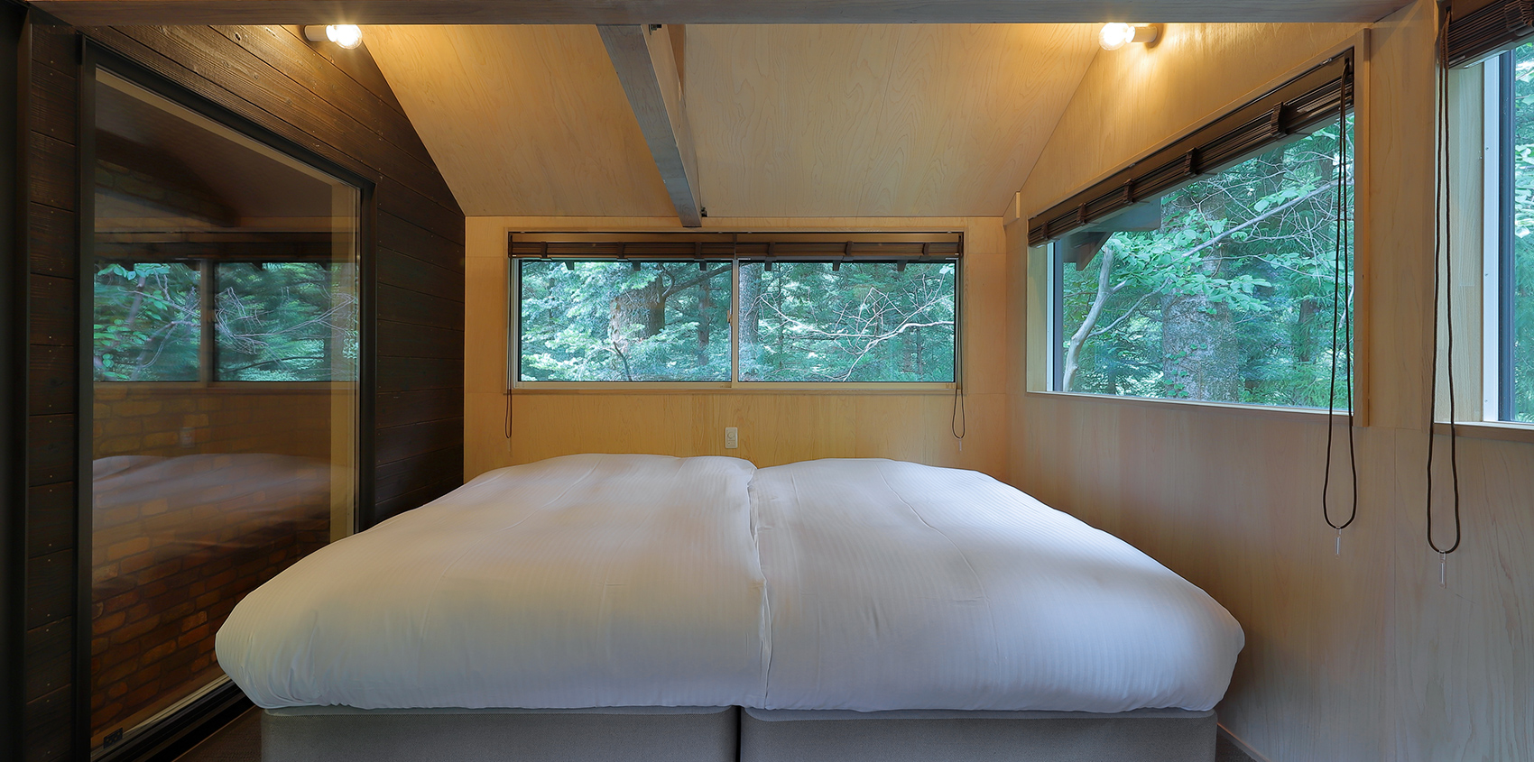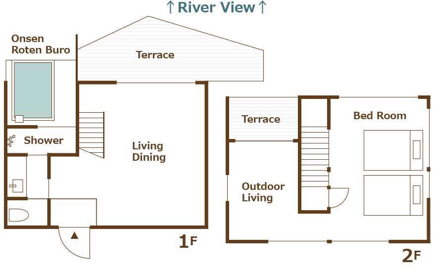 <1F> 温泉半露天風呂+リビング・ダイニング+展望テラス(BBQ焼台 炭グリル)+シャワー+トイレ+洗面所 <2F> アウトドアリビング+ベッドルーム(セミダブルロングベッド×2)+展望テラス